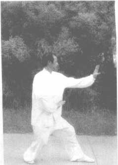 动作不停,腰胯迅速左抖(拧),左脚向后蹬劲(不得抬起),同 时,右脚向前进一步(与左脚成三体式步型),右手从下向前上方挑 出(立掌),高与额齐,左手后劈至左胯处向下按住劲,向后拉住劲。 头向前上方顶住劲,腰部挺住劲,眼看右手食指梢节。如图241所 Z5。