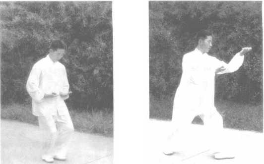 左脚不动,右脚向右后斜退一大步,身体下伏.重心下移偏「 左脚,成左弓步状,眼看右手虎【1处。如图335所示。