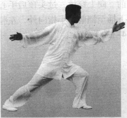 ③右足向前上一大步, 屈膝半蹲,落地站稳。左足 跟至右足内侧不落地,两膝 靠紧,左脚尖翘起,靠于右 脚踝关节处。同时,两臂左 右分开,两肘微屈,两手立 掌左前右后,掌指向上,手 心向右,两手高与肩齐,目 视左掌(图4-139 )o