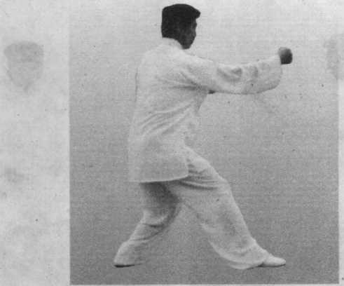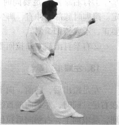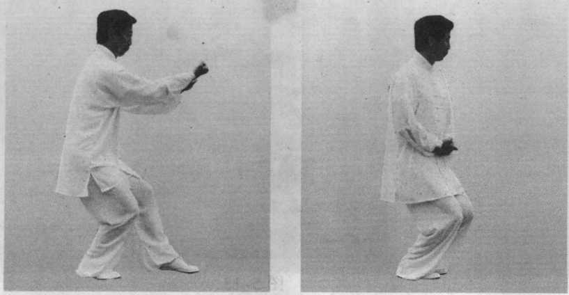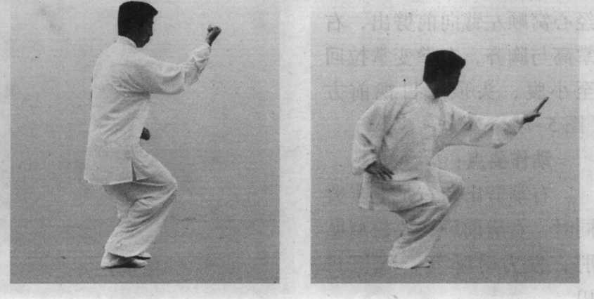 ②左横拳与右足进步落地要同时,两足要有夹剪之力。左 膝内合,有向下插的意念。拧腰顺肩,臀部向下坐,头向上 顶,有上下拔伸的感觉。