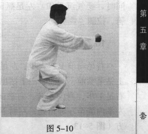 左足向前进一大步,右足 向前蹉地跟步,跟至左足跟处, 落地有声。同时,右手握拳向 前打出崩拳,高与胸齐。左手 扶于右腕部,头向上顶,目视 右拳前方(图5-10)。