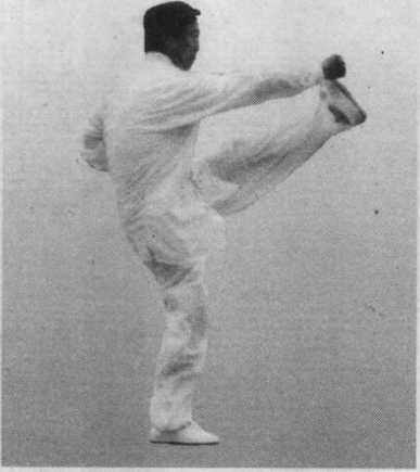 ①右足撤回至左足前,提膝勾脚尖向上抬起至小腿肚处, 左腿独立屈膝站稳;同时,右手抓握拉回成拳至腹,经心窝至 嘴前向上钻出,高与眉齐。左手抓紧握成拳,上提至胸,目视 右拳(图5-8 )o