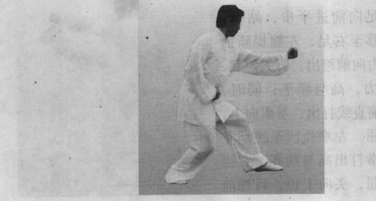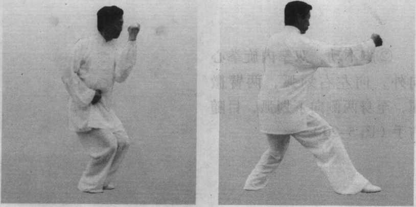 左拳打出,右拳拉回与左足进步落地要同时,要三者合 一,上下左右整齐一致。