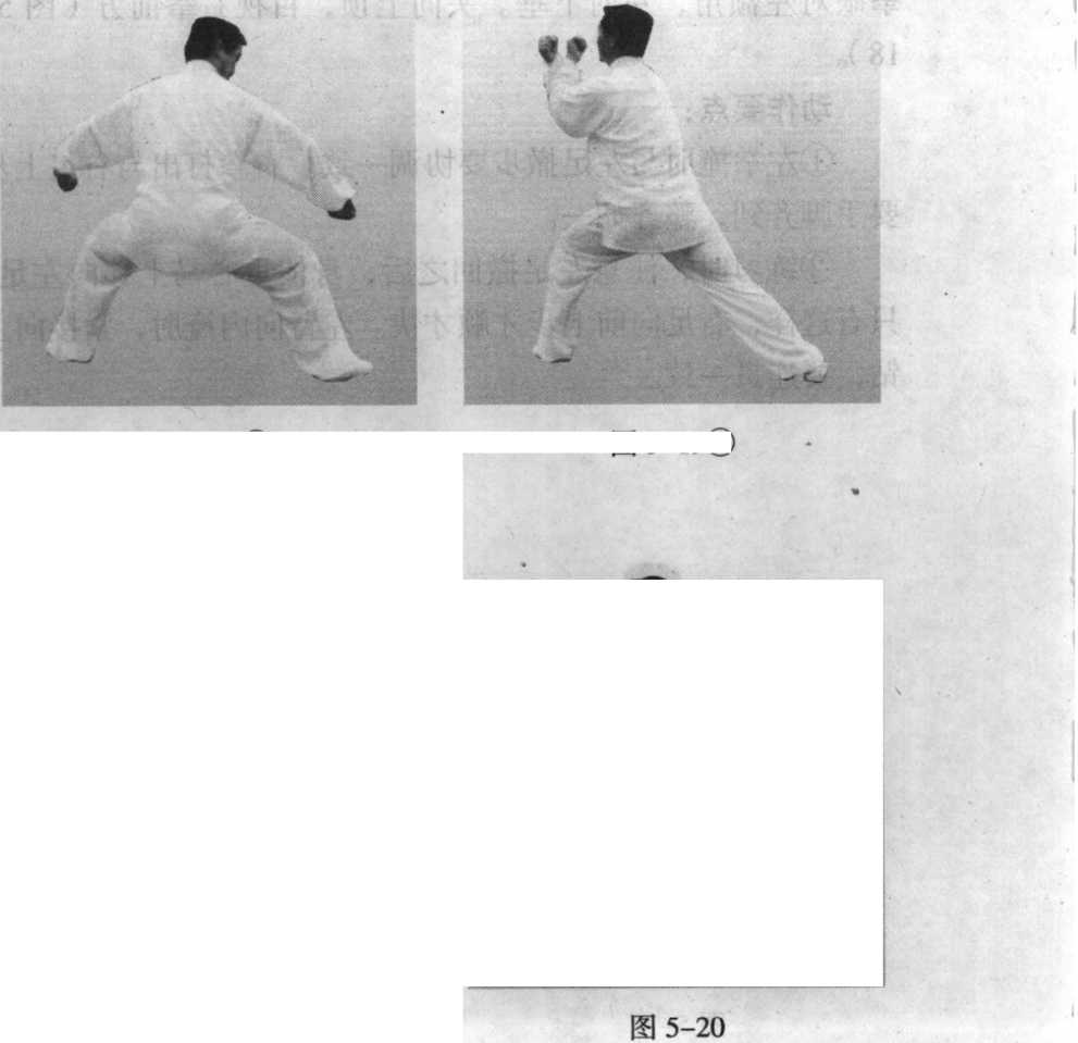 ②脚不动,双拳内旋拳心 向外,向左右划弧,两臂微 屈,至身两侧向下划弧,目随 右手(图5—20 )o