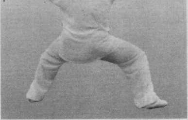 ②身体重心的移动是先左、后右、再向左。右足撤回与双 拳砸击小腹要同时,气沉丹田以助发劲。