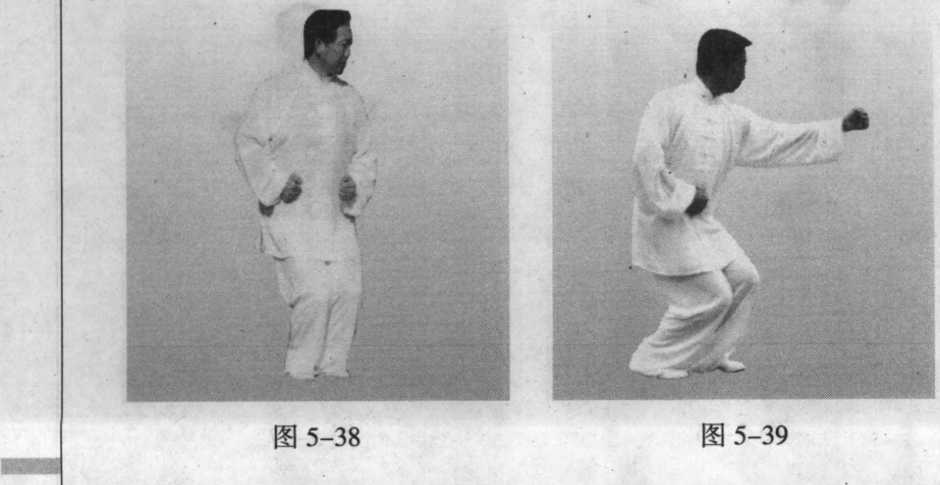 ①右掌向右划弧下落,收回于右腰侧握拳,拳眼向上。同 时,左手抓握成拳,在身前下落,回至腰前,拳心向内,左肘 紧贴左肋。身微右转,目视右拳(图5-38)。