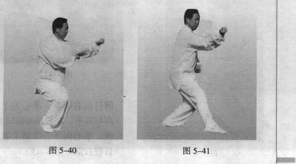 ①左足向前进半步,右足跟进至左足内侧不落地。同时, 左拳外旋使拳心向上,左肘微向内掩。右拳内旋,使拳心向 下,自右腰侧向身前穿至左腰侧,目视左拳(图5-40)。