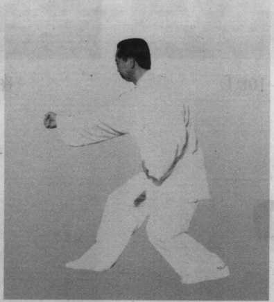 ②整个动作中还要注意身体重心左右的移动。双拳上钻 时,重心向左移,双臂外撑时,重心向右移,双拳裹抱时,重 心移向左足。