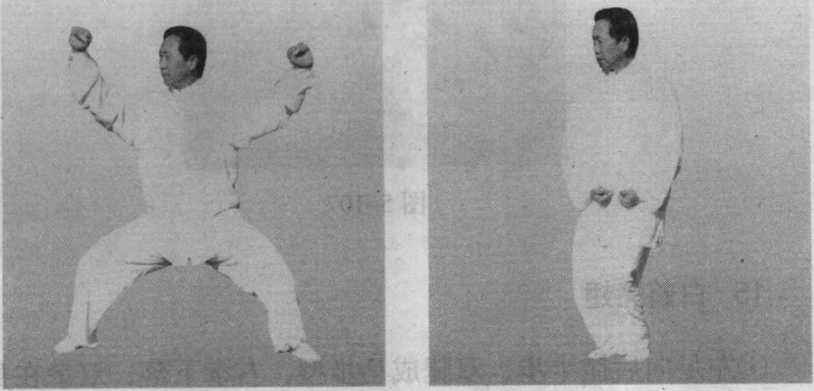 图5-108① 图5-108②图5-108① 图5-108②图 5-109? 图 5-109②图 5-109? 图 5-109②②双拳内旋以拳心向外,两臂微屈成圆,双拳向左右划 弧,收于小腹前;同时,右足拉回至左足内侧,震地有声,头 向上顶,气沉丹田,目视右拳(图5-109①②)。