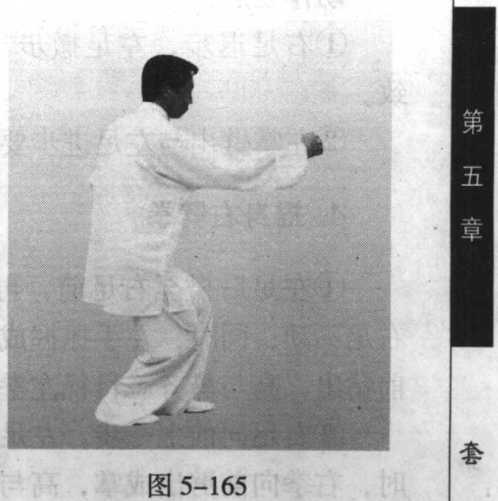 高与胸齐,拳眼向上,右臂 微屈,头向上顶,右肩前顺。 目视右拳前方(图5-165)。