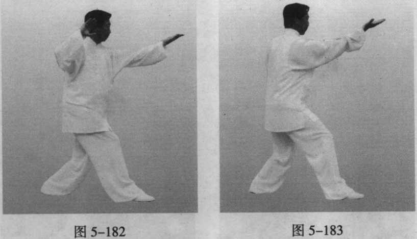 ①两足不动,重心后移至左足;同时,右手屈肘回挂至右 耳前,手心向里。左手掌心向上、向前伸臂,由左向右横切, 高与鼻齐,左肩微向前顺,左臂微屈。目视左手(图5-182)。