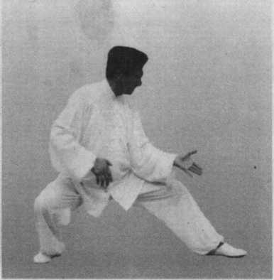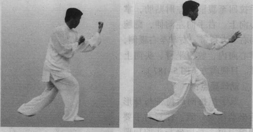 注意身形有欲前先后的微小动作。右手撩出与右足上步要 整齐一致。