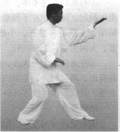 右手拉回与左掌向前横切, 要以腰转带动两肩,两手要走 一弧形。体会欲左先右的身法。