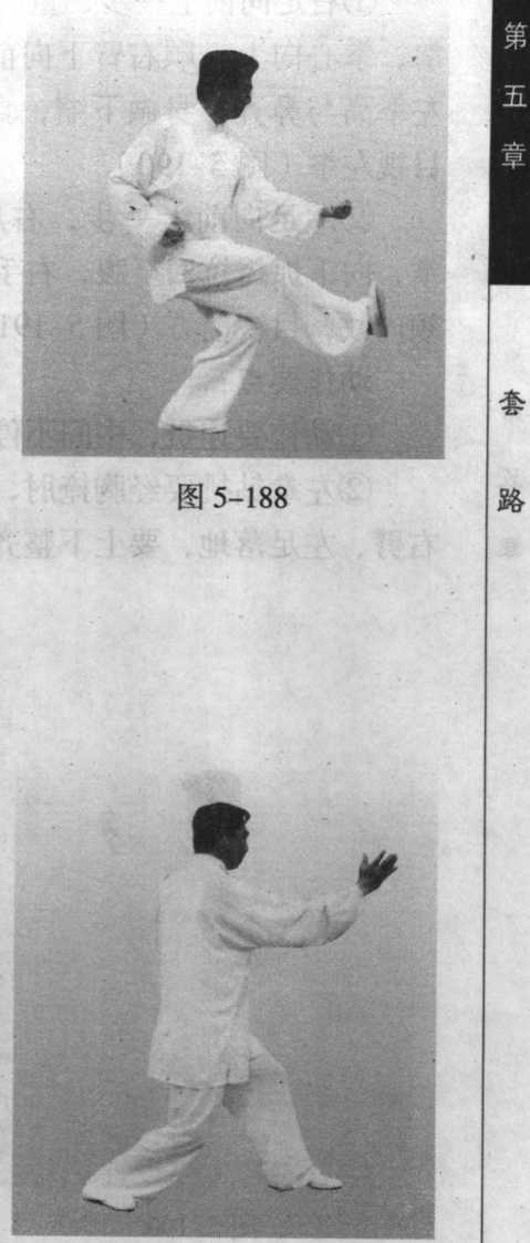 重心前移至左足,右足提 膝,脚尖外摆,向前蹬出,高 与膝平。左腿屈膝独立站稳, 双手微向前送,两拳心向上, 两肘抱肋,两拳在胸前,身微 右斜。目视右足前方(图5- 188 )o