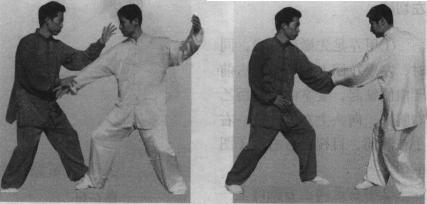 ①甲右足后撤与右拳上钻 要同时,动作要快。上钻之拳 前臂要有向前的撑劲。上左 步、劈左掌与右掌向下捋拽动 作要一致。对练中右手不要抓 捋,有这个意识就可以了。换 步要快。