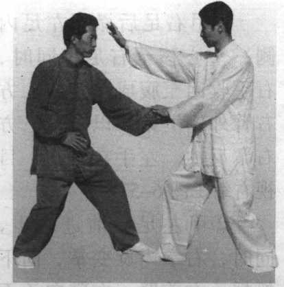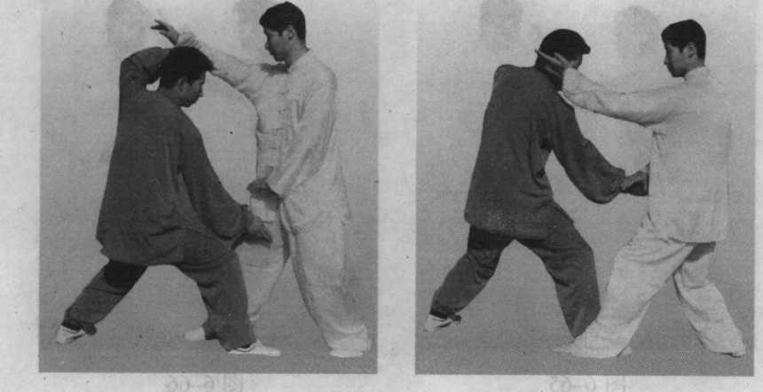 ①蛇形最主要的技法就是撩裆。实际用法是上手刁捋向后 拉拽,上步进身而撩裆。上步要插进敌人裆内,含有进身肩撞 之法。关键在于进步近身,步法要活要快。在对练中,注意左 手不要刁捋抓住。撩裆时,右手要有定点,不要真的去撩裆, 以免发生危险。此势身形微低。