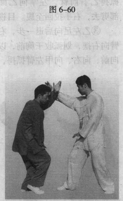 ④乙右足向前进半步,同 时,左手向下拉回至腹,右手 向甲方头部打去,掌心向前, 目视右手(图6—60 )o