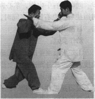 ②乙退步要快,重心随之后移。右手下挂右拨,要准确。乙 方右足后退时,身体要随之侧身,使甲方撩裆失去目标。左手向 前切脖,要和拧身相一致。注意要有定点,要停在甲方颈前。