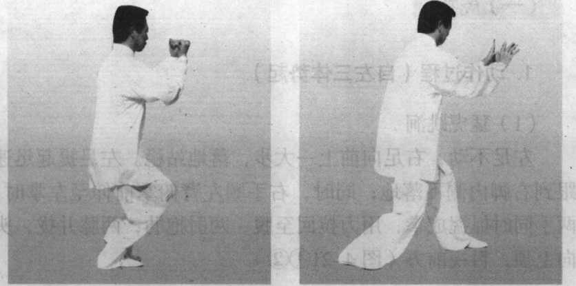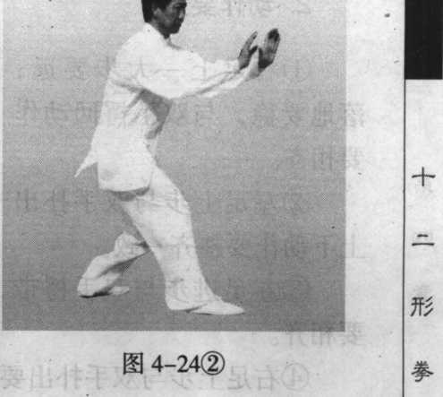 图 4-23图 4-23②右足向右斜前方上 一大步,左足跟进半步; 同时,两拳拳心向上,自