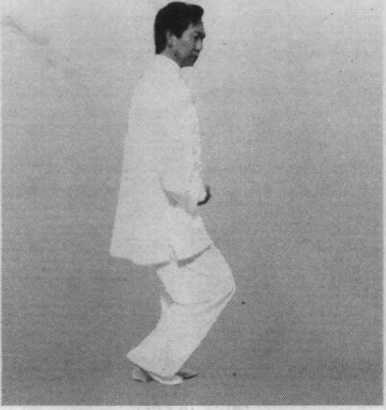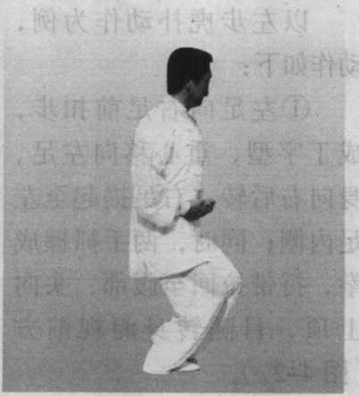 ①右足向前方进半步, 左足提起跟至右足内侧不落 地;同时,两掌向下、向回 抓捋带回至小腹成拳,拳心 向内,紧靠小腹,目视前方 (图 4-25 )o