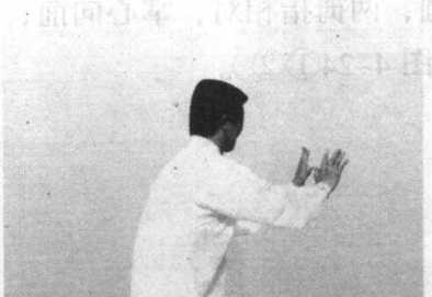 腹部经心窝向上钻至嘴前,两拳翻转变掌向前扑出,虎口撑 圆,两拇指相对,掌心向前,掌指向上,高与胸齐,目视前方 (图 4-24(D(2))o