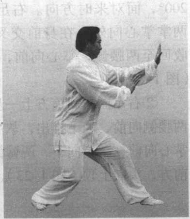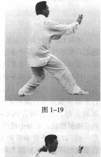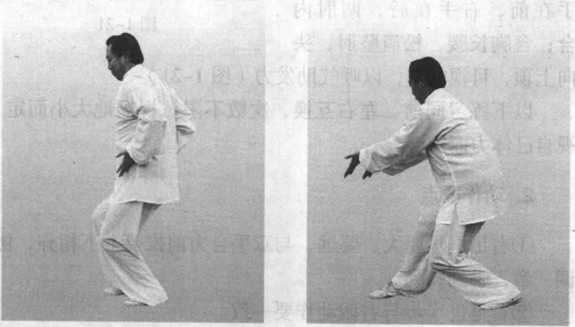 左足向前上一大步,右足 跟进半步,大部分重量在右 足;同时,左拳内旋变掌,沉 肘向前伸臂推出,左臂微屈, 左掌高与胸齐。右手一起用力 向前推出,右手在左手腕后, 掌心向前,两掌同时用力,左 手在前,右手在后,两肘内 合;含胸长腰,松肩坠肘,头 向上顶,目视前方,以呼气助发力(图1-21 )。