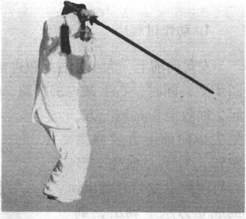 下、向后贴身左侧下 挂,并向上抡起至头顶 后上方,右手腕部要 活,在身前绕一小圆; 左手剑指扶于右腕;目 随剑走,眼平视前方 (图 3-81 )o