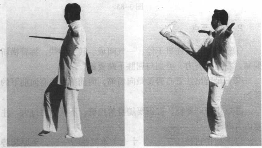 左腿站稳微屈,右腿屈膝提起,向前、向上横脚蹬出,右 脚尖外摆,高与胸齐;目视右脚前方(图3-84)。