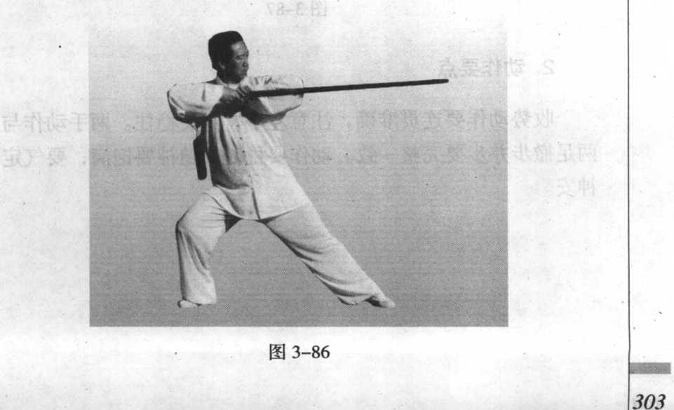 (上接进步崩剑)右足向后退一步,重心后移,大部分重 量在右足,左腿微伸直脚尖内扣;同时,右手向后抽拉至右肩 前,右手剑成立刃,剑成水平,高与肩齐;左手屈臂内旋,以 手心向外,拇指向下,抓握剑柄;身右转90。,目视剑尖前方 (图 3-86 )。