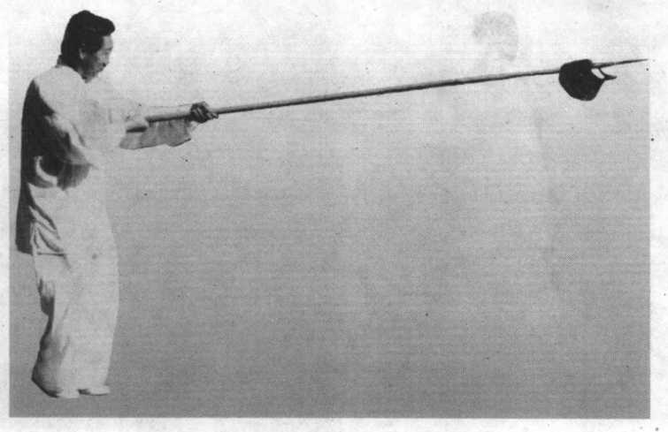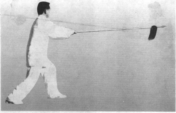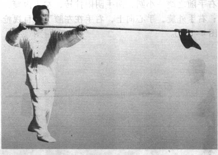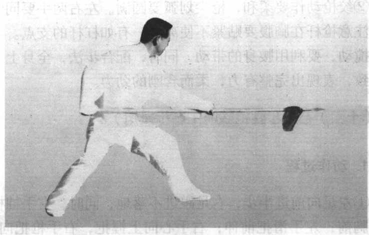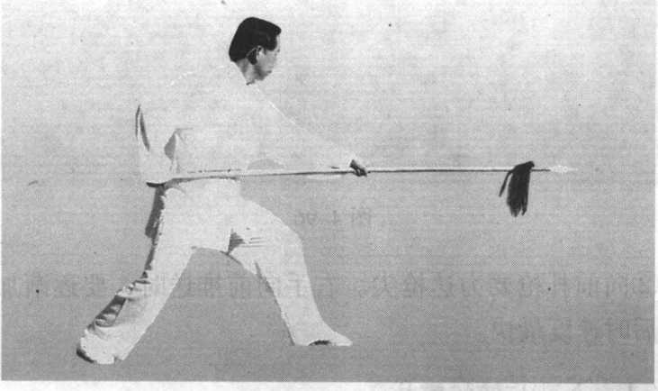 ⑤两足原地不动,重心前移,大部分重量在左足;左手松 握如管;右手用力向前扎出,枪尖高与胸齐,枪身成水平,力 达枪尖;目视枪尖前方(图4-101 )o