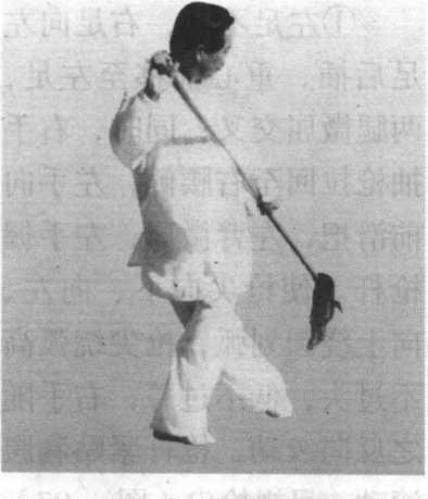 图 4-99图 4-99④左足向前上一步,右 足不动;右手枪把拧回至右 腰侧,左手使枪尖向右、向 下划弧盖拿。枪身成水平, 枪尖高与腰齐(图4-100)。