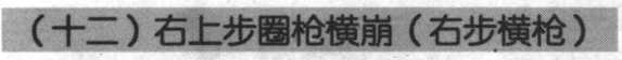 ②右足向右斜前方上一大步,左足跟进半步,大部分重量 在左足;同时,左手在前,向前滑把,左手向右前摆臂横推, 手心向右,握紧枪杆制动;右手握枪把,向内拧旋,并用力向 右、向后抽拉,使手心向外,右臂屈肘,右手枪把拉至右肩 前,使枪尖向右横向崩发抖动,力达枪身前段,枪身略平,枪 尖略高于肩;目视枪尖前方(图4-103 )o