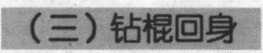 钻棍回身法无论是右顺步 钻棍、左顺步钻棍,还是拗步 钻棍,欲回身都是以拗步钻棍 动作回身,只是第一步的扣脚 不同,但都是右足扣步,左转 身。如右足在后时,右足向前 上一