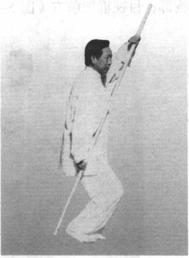 如右足在前时,右足向 后退一步。如左足在前时, 则右足向后退半步。然后左 足撤回,向右足并拢,两腿 蹬直站立,身右转45。,成 立正姿势;同时,右手握 棍,拉回至体右侧,向头上 直棍举起,右臂微直;左手 握棍把,推至右腋下;目向 左平视(图5-39)。
