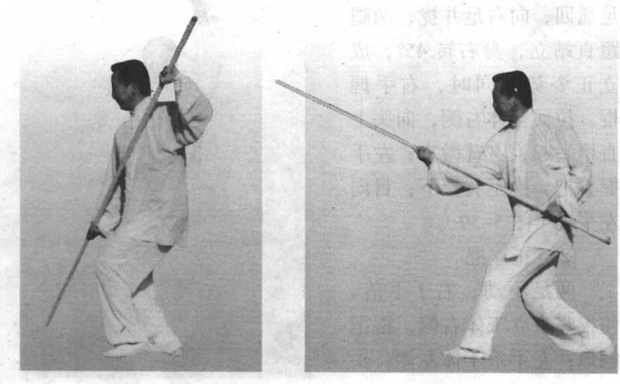 ②左足上步与棍的擢挑动作要整齐一致,动作要点和劲力 与拗步钻棍相同。
