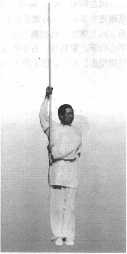 两足不动;右手下落, 使棍竖直立于体右侧,棍把 触地;左手垂于体左侧;头 向上顶,目视
