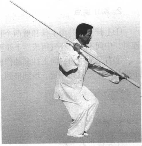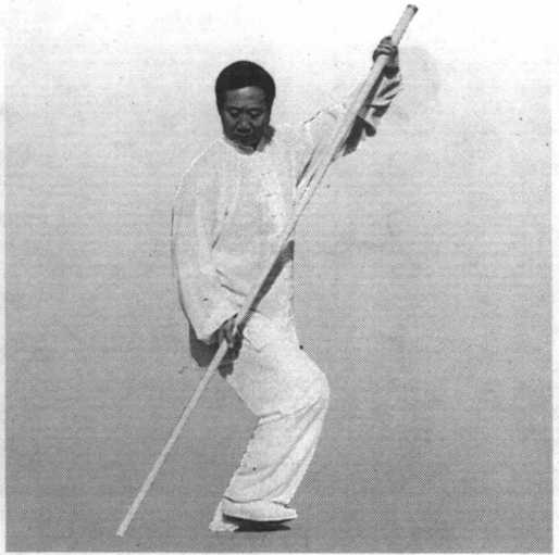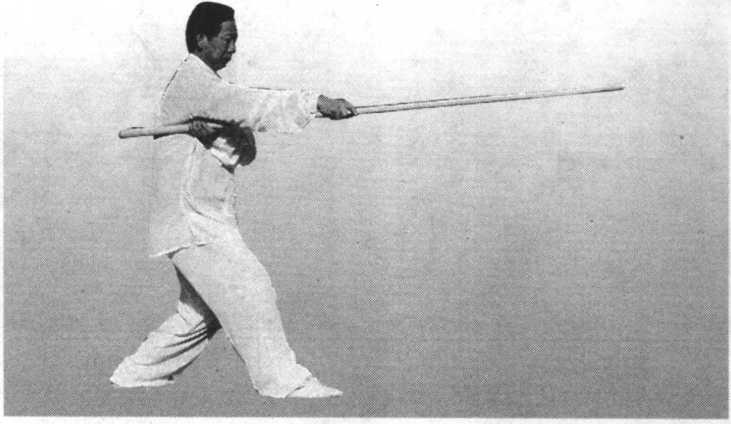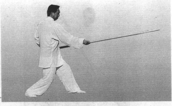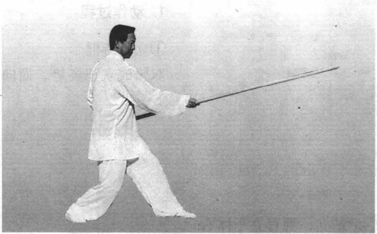右足向前上一大步,落地站稳腿微屈,左足跟进至右 足内侧不落地;同时,右手使棍梢先向下落与腰平后,再