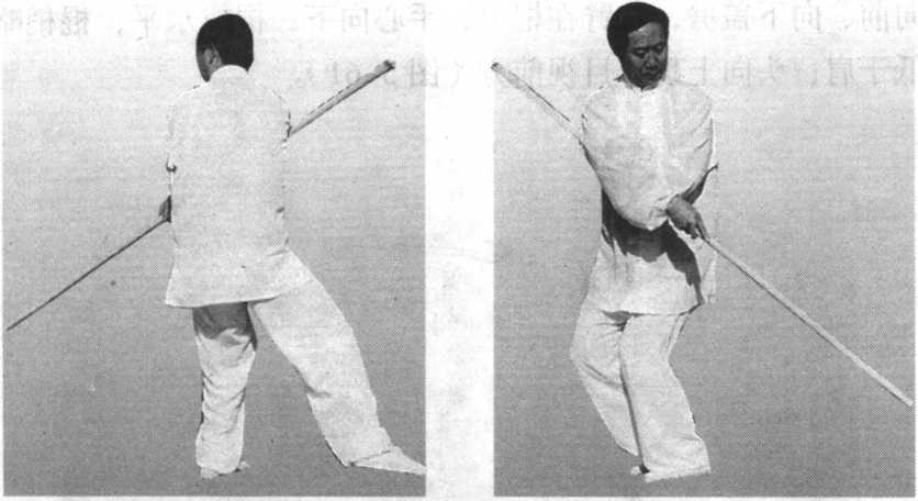 左足向后退半步,右足后撤至左足前;同时,右手使棍梢 由前向下、向后,经体左侧向上摆起,身微左转;左手在右腋