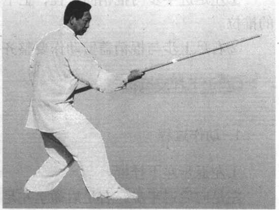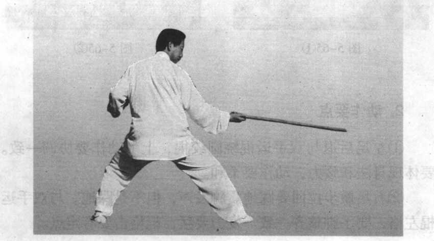 重心微向前移至右足,左足向后退半步;同时,右手握棍 划弧,使棍梢向上、向左、向下绕圆划弧,圆弧直径约40厘 米,棍梢至前上方;左手棍把在腹前随之搅动;目视右手棍梢 前方(图5-64 )o