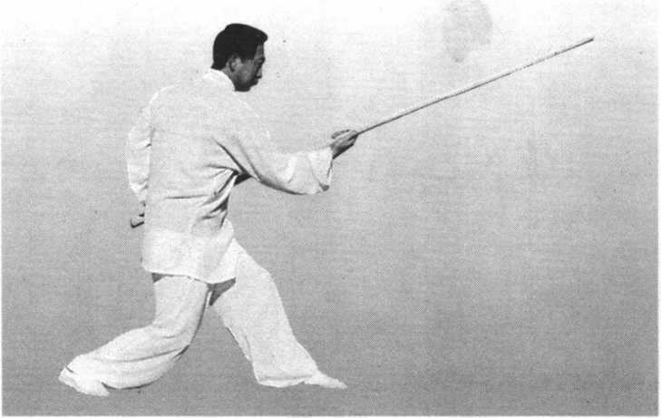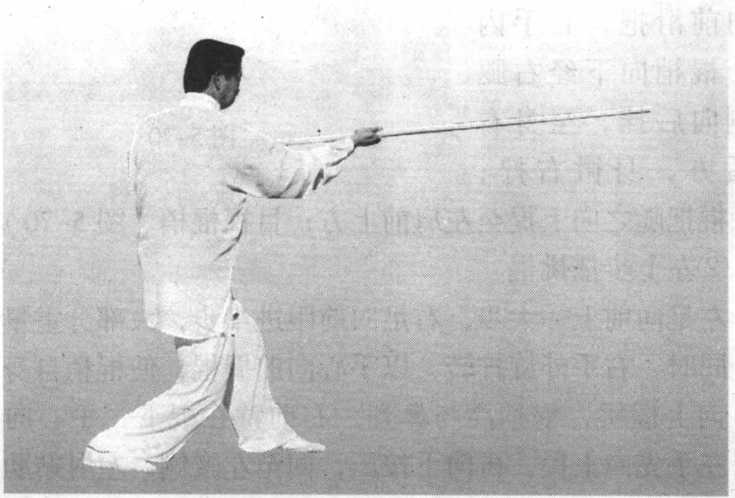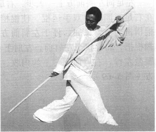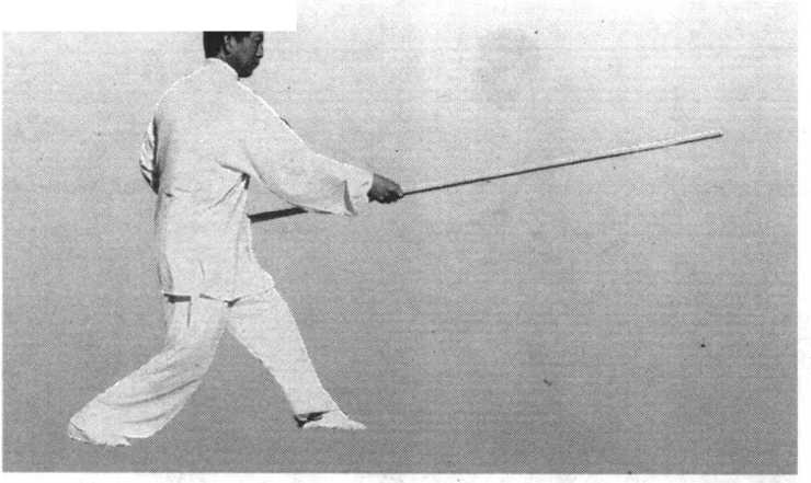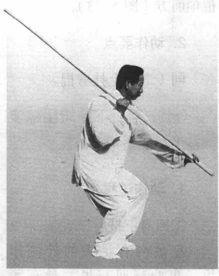 图 5-70图 5-70重心前移至左足, 左足不动,右足向前 上一步;同时,右手 微向前滑把,右手内 旋,棍梢向下经右腿 外侧向后挂,至身右 侧后方,身微右拧; 左手棍把随之向上提至左肩前上方;目视棍梢(图5-70)。
