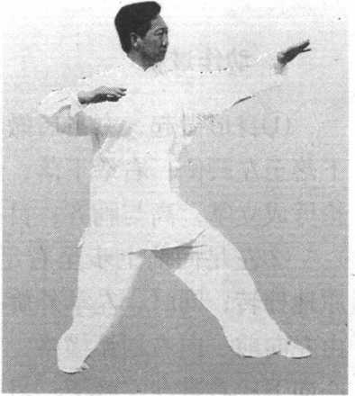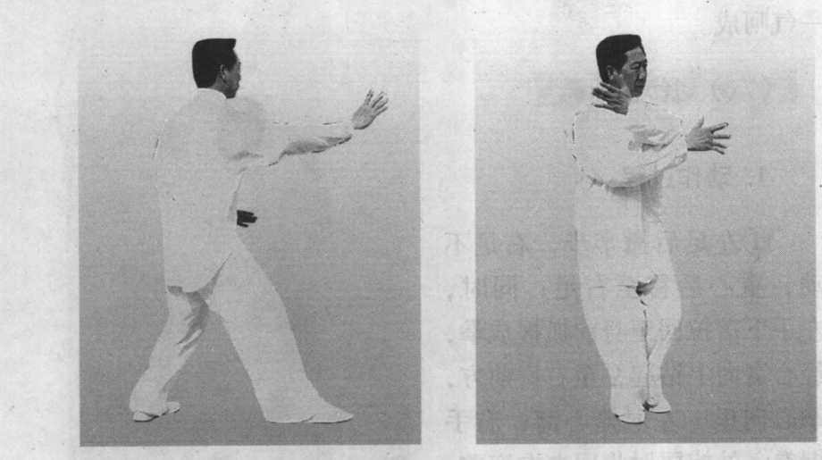 ③左手横斩与左足上步和 右臂后撑要整齐一致。两臂要 撑圆,要开胸实腹,发力呼气。
