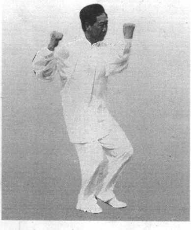 ①左足后撤半步,右足不 动,重心后移至右足;同时, 左手下落拉回至身前抓握成拳, 经心窝向上钻起,至右肩前方, 拳心向里,左肘掩心窝;右手 握拳,外旋屈肘收回在右肩前, 拳眼向后,高与头齐;目视前 方(图 1-111 )。