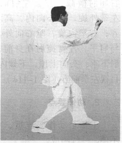 ②右足向右斜前方上一大步,左足跟进半步,大部分重量