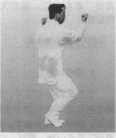 ①左足向前进半步,右 足跟进不落地;同时,双拳 微伸,向前下落;右拳屈肘 上钻,经心窝向上至左肩前, 拳心向里;左拳向后、向上 划弧,屈肘外旋至左肩左侧,