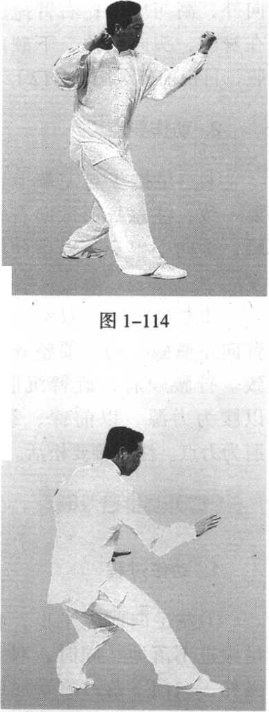 图 1-115图 1-115右手在前,左手在后,两掌同时自右前方向左、向下、向后捋 带,左手拉至左腰侧,右手捋至腹前;收腹含胸,腰微左转, 头向上顶,目视前方,(图1-115)。