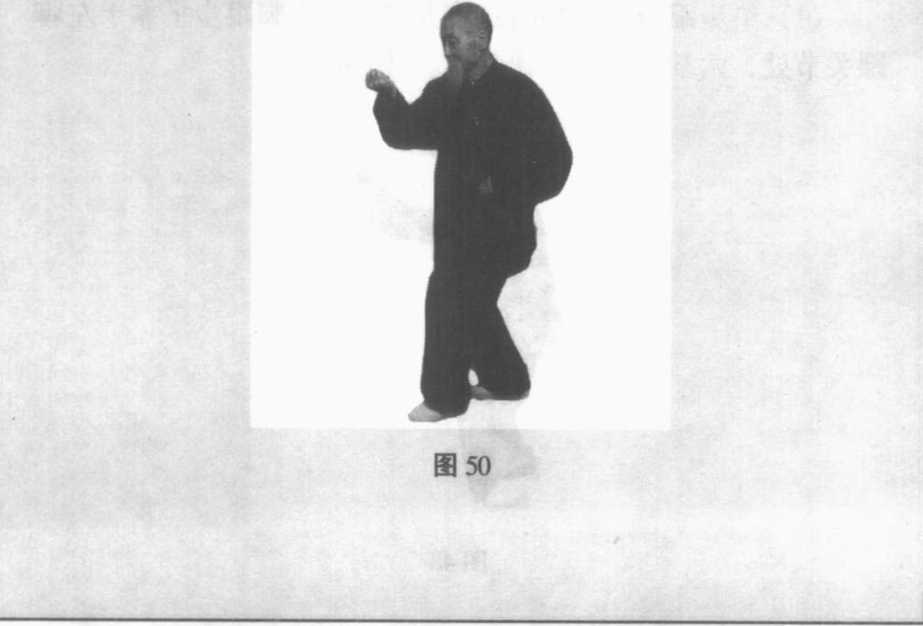 以右拗步左横拳为例。下肢与炮拳相同,上肢不动,转身 接着做左拗步右横拳。(图50)