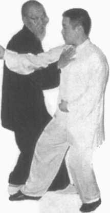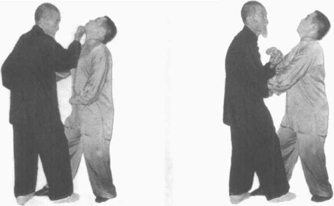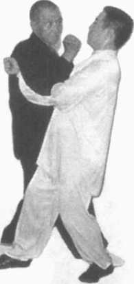 动作要点:左手横拨要以横破直,右脚进步要插在对方两 腿之间,即所谓过步击人。