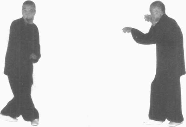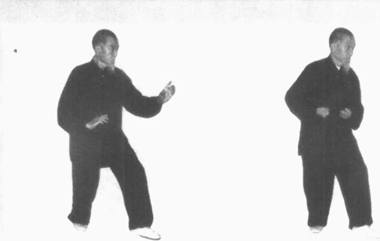 4. 退步抓勾:猴子叨绳。撤右脚,收左脚,成虚步。同