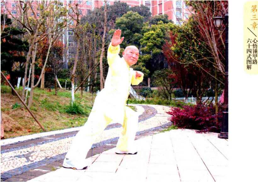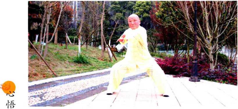 当正马步腰胯左旋转,其重心于右脚漸移至左脚而成左弓步之 反身状,左手臂屈肘后拉,右手臂侧屈腕向前上斜推,该组合之式,其劲路务 必起于右足,并顺膝随腰而至双手臂,形如蛆动之劲势而节节贯穿另张弓之 势应大开大合,击长放远,并有力拨千斤之意境