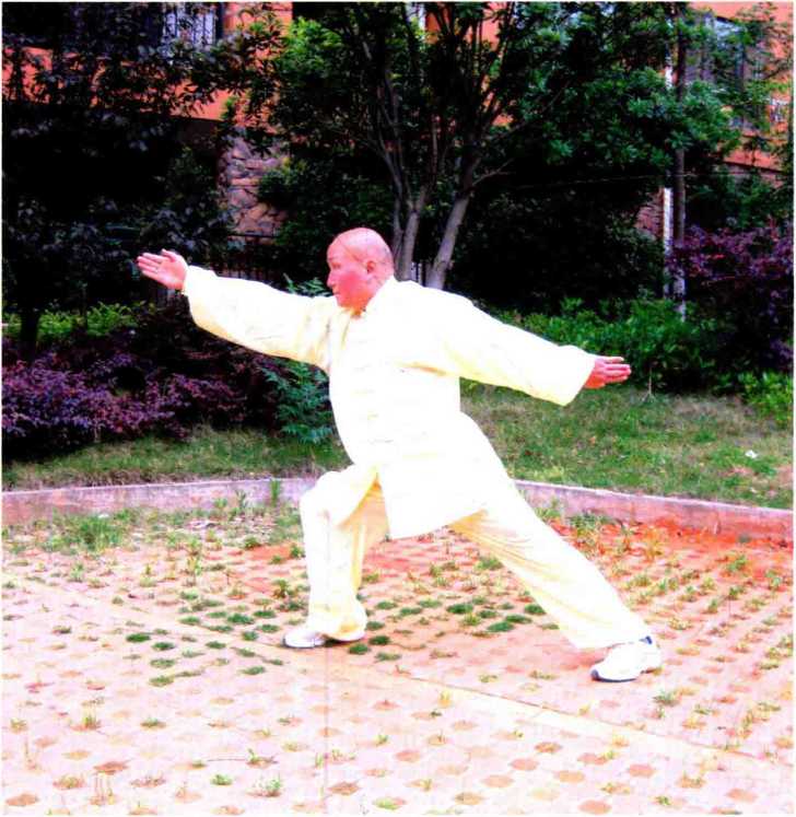 腰胯继续向右旋转,其重心于左脚渐移向右脚,以至右足底均着地,其膝并随 之向右前下屈,左膝同时随势向右伸直,成右弓步。双手臂于腰、肩左侧,同 时顺随腰胯向右旋转,重心右移之势而双手臂屈肘,并以肩关节为轴心,从左 下经左上而至双小臂直立于额前,双掌心向前.指尖平额,成右弓步,双小臂 直立于额前之式(向北)。不停,腰胯向左旋转,重心完全移至于右脚,右膝 即稍下屈,左脚于右脚之后(向北),同时顺随腰胯左旋其势向右脚之后插一步, 右手臂屈肘至其掌立于于额前,同时顺随腰胯左旋,并于上向右下而小臂外旋 至右掌收于腰右,左手于原式立于胸前基本不动。不停,腰胯以右足前掌为圆 心而继续向左旋转,左脚稍屈膝并顺随腰胯左旋转而自然于右脚之后(向南), 右脚于左脚前稍屈膝,重心随之渐于双足之间,左手臂于胸前屈肘,同时顺随 腰胯向左旋转左脚后退之势,而至左掌稍下移而于右腹前,其掌心向下。右手 于腰右同时顺随其势而向前伸至额前,并稍屈肘,其手指平额,掌心向上。不停, 随呼吸,重心下沉,双膝同时下屈,成侧马步,左足于后迅速瞪地而至其膝向 上伸直。右足于前与左足同时迅疾S登地,而至右膝随势迅速上拔伸直,并足跟 上抬,其足前掌着地,成左脚直立、右脚伸踝而虚步之式。其炁劲至左手臂屈 肘其掌于腹前顺随其势,同时大臂疾速上抬,并向左后屈肘至极,其肘尖平左耳, 掌心向下。右手臂稍屈肘至其掌于额前,同时顺随其炁势并以肩关节为轴心而 至右手臂迅疾下压,以至其手臂前斜于右大腿前(右掌于右膝前),掌心向前。 成左脚直立、右脚于前伸踩而稍虚立,左手臂向左后上方屈肘,右手臂斜垂于 右大腿前之式。